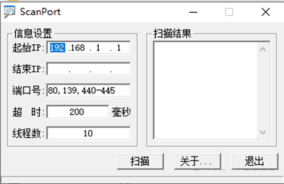 ScanPort是一款掃描IP端口的小工具。安裝環(huán)境操作系統(tǒng):Windows7及以上資源鏈接:https://pan.baidu.com/s/1RVWsJPRdPubjB9ppBTh4Bg提取碼:xyj1安裝步驟第一步、下載并安裝解壓壓縮包即可。第二步、測(cè)試使用方法1、雙擊exe文件即可2、可以設(shè)置掃描開始的IP和結(jié)束...