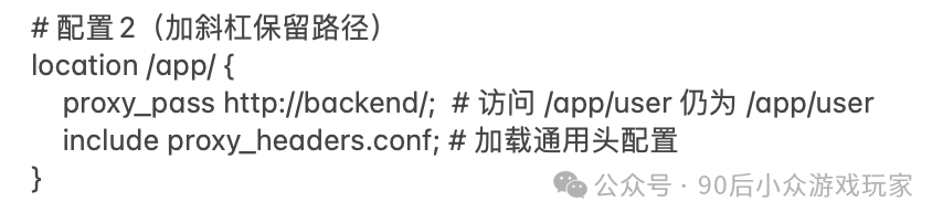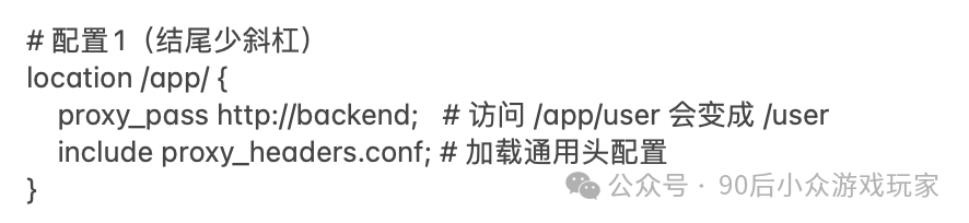 01 反向代理 我們類比一下銀行柜臺(tái)辦理業(yè)務(wù)的場(chǎng)景,nginx相當(dāng)于叫號(hào)機(jī),服務(wù)器ABC分別對(duì)應(yīng)不同的銀行柜臺(tái)。通過(guò)叫號(hào)機(jī)把客戶分配給不同的柜臺(tái)辦理。 核心作用: 02 — 實(shí)例展示 場(chǎng)景一:把 重要原則:所有 避免重復(fù)寫上面的傳遞頭配置,我們可以用include來(lái)解決: 然后修改一下上面寫法: 場(chǎng)景二:把不同請(qǐng)求導(dǎo)向不同服務(wù)器 03 — 踩過(guò)的坑 用戶訪問(wèn)的是/app/user/profile,經(jīng)過(guò)反代之后轉(zhuǎn)發(fā)到http://backend/app/user/profile 用戶訪問(wèn)的是/app/user/profile,經(jīng)過(guò)反代之后轉(zhuǎn)發(fā)到http://backend/user/profile 避坑總結(jié): 1、proxy_pass結(jié)尾的斜杠本質(zhì)是URI替換指令,有斜杠的情況下,用指定URI替換location匹配路徑;無(wú)斜杠的情況下,拼接location路徑到代理地址后。 2、使用調(diào)試模式,打印日志,幫助自己直觀的看到結(jié)果。 閱讀原文:原文鏈接 該文章在 2025/7/18 10:57:11 編輯過(guò) |