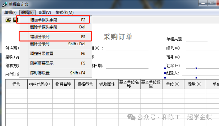 左上角編輯下面有增加單據(jù)頭字段和增加分錄列 單據(jù)頭字段:指表頭和表尾 增加分錄列:指表格框里面的內(nèi)容