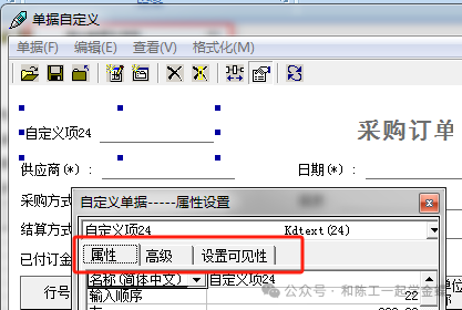 點(diǎn)擊編輯→增加單據(jù)頭字段,在左上角即可看見有一個(gè)自定義項(xiàng)24, 點(diǎn)中自定義項(xiàng)24右擊屬性,彈出自定義單據(jù)-屬性設(shè)置 界面, 在自定義單據(jù)-屬性設(shè)置 下有屬性、高級(jí)、設(shè)置可見 三個(gè)頁(yè)簽