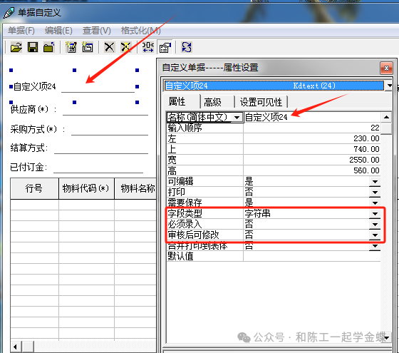 1 屬性: 名稱:設(shè)置該字段的名稱 字段類型:可以設(shè)置是字符串,單價(jià),數(shù)量,金額,還是日期格式 必須錄入:如果設(shè)置是,那么新增單據(jù)時(shí)必須錄入,不然單據(jù)保存不了 審核后可修改:意思就是就算是單據(jù)審核后,也是可以直接修改的,不需要反審核單據(jù) 需要合計(jì):主要針對(duì)分錄列增加的金額類字段,對(duì)所有分錄進(jìn)行一個(gè)合計(jì)
