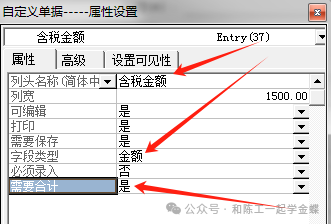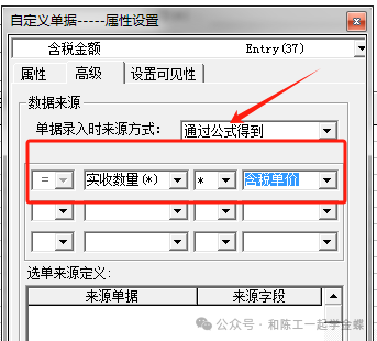 含稅金額:名稱修改為含稅金額,字段類型選擇金額,需要合計(jì)選擇是,高級(jí)里面單據(jù)錄入時(shí)來源選擇通過公式得到,設(shè)置含稅金額=實(shí)收數(shù)量*含稅單價(jià)