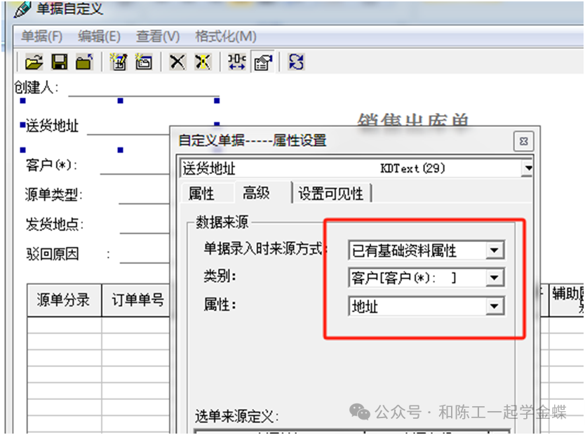 再舉個(gè)例子:銷售出庫(kù)單上要體現(xiàn)客戶的地址,新增單據(jù)頭字體,名稱設(shè)置地址,字段類型選擇字符串,高級(jí)里面,單據(jù)錄入來源方式已有基礎(chǔ)資料屬性,類別客戶,屬性地址,這樣就會(huì)取基礎(chǔ)資料中客戶資料里面的地址