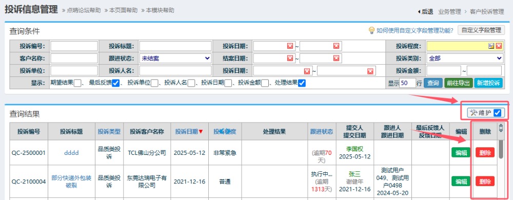 ”,在需要刪除的投訴行,點(diǎn)擊“