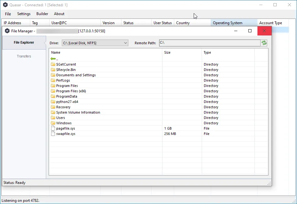 QuasarQuasar是一個(gè)免費(fèi)(MIT License)、開(kāi)源的遠(yuǎn)程管理工具,專(zhuān)為Windows系統(tǒng)設(shè)計(jì)。它使用C#語(yǔ)言編寫(xiě),具有輕量級(jí)、高穩(wěn)定性、易用性的特點(diǎn)。Quasar為遠(yuǎn)程技術(shù)支持、系統(tǒng)監(jiān)控和員工監(jiān)控等提供了強(qiáng)大的解決方案。兼容Windows 11、Windows Server 2022、Windows 10、Windows 8/8.1、Windows 7等多個(gè)操作系統(tǒng)版本。集成任務(wù)管理器、文件管理器、啟動(dòng)管理器、遠(yuǎn)程桌面、遠(yuǎn)程Shell、遠(yuǎn)程執(zhí)行等多種管理工具。