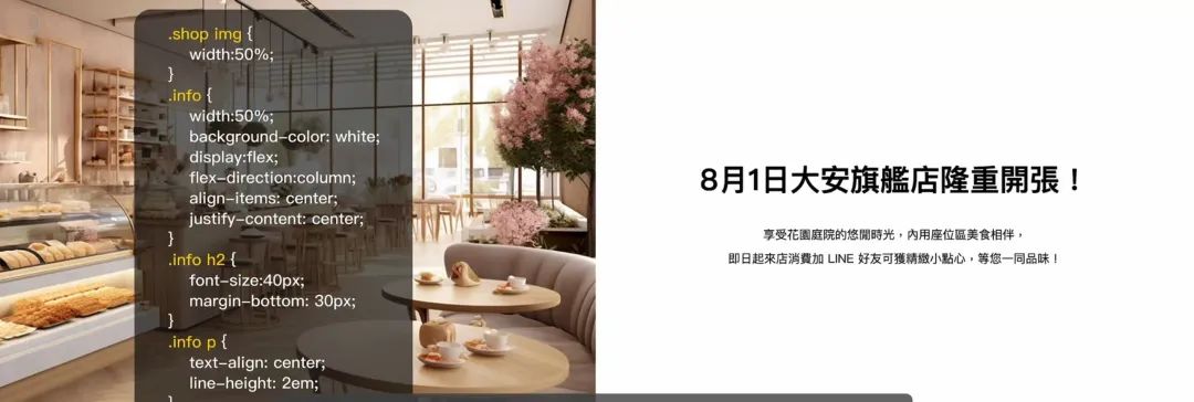 當(dāng)你用Flexbox輕松實(shí)現(xiàn)導(dǎo)航欄、卡片流之后,是否遇到這樣的場(chǎng)景:左側(cè)需要展示精美環(huán)境圖,右側(cè)要放置活動(dòng)文案? 這類「圖文左右分列」布局正是商業(yè)網(wǎng)站的高頻需求!今天我們就用Flexbox的延伸技巧,實(shí)現(xiàn)像示例中咖啡店宣傳頁(yè)一樣的顏值+信息量雙贏設(shè)計(jì)??