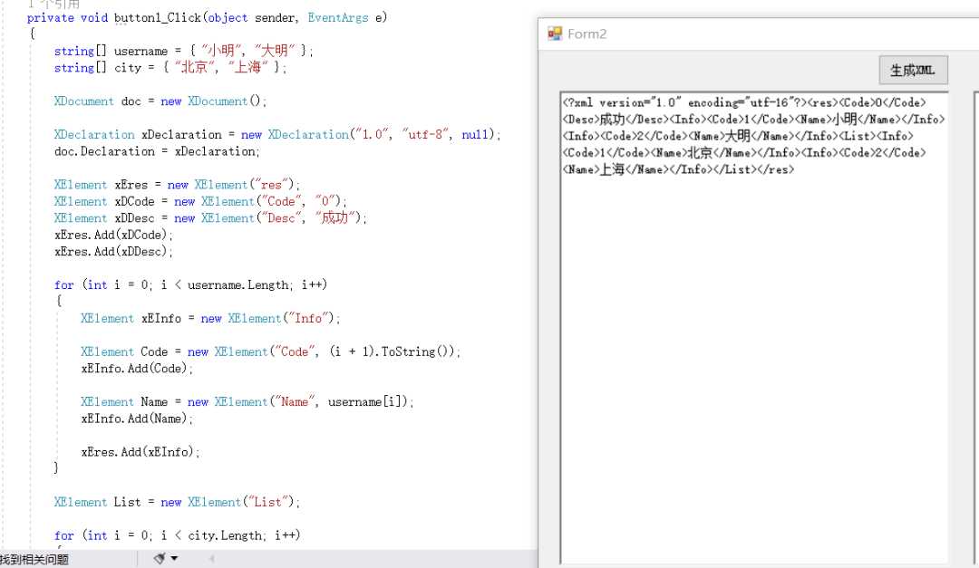 核心組件:LINQ to XML (System.Xml.Linq)輔助組件:System.Xml, System.IO一.創(chuàng)建一個(gè)C#窗臺(tái)程序用來(lái)演示C#操作XML,生成XML格式數(shù)據(jù)<?xml version="1.0"?><res> <Code>0</Code> <Desc>成功</Desc> <Info> <Code>1</Code> <Name>小明</Name> </Info> <Info> <Code>2</Code> <Name>大明</Name> </Info> <List> <Info> <Code>1</Code> <Name>北京</Name> </Info> <Info> <Code>2</Code> <Name>上海</Name> </Info> </List></res>