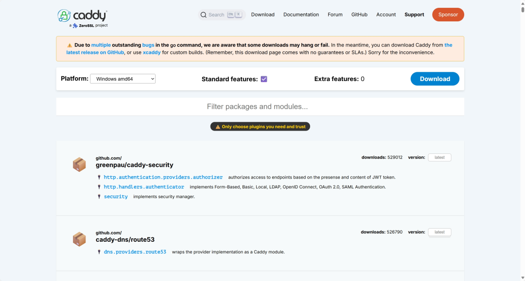 下載安裝Caddy 提供了多種安裝方式,包括 Docker 鏡像。其中,官方下載網(wǎng)站如下: https://caddyserver.com/download