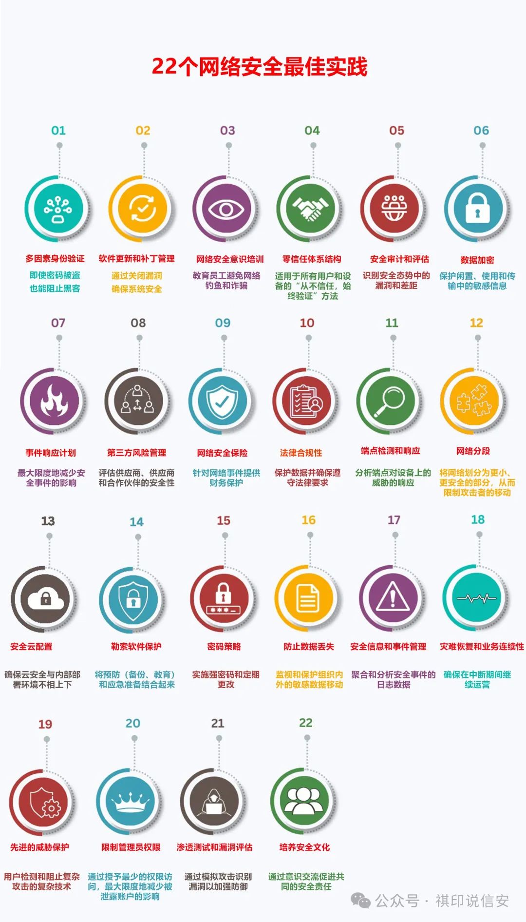 以下是需要牢記的22個(gè)網(wǎng)絡(luò)安全最佳實(shí)踐要點(diǎn): 1. 多重身份驗(yàn)證2. 軟件更新和補(bǔ)丁管理3.網(wǎng)絡(luò)安全意識(shí)培訓(xùn)4. 零信任架構(gòu)