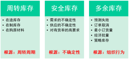 企業(yè)的資源不是無限的,所以降庫存是不可避免的。但在降庫存的方式上,很多企業(yè)采取的是“搞運動”的方式,沒法觸及根源,屢降屢升,屢升屢降。 比如現(xiàn)金流緊張的時候,老總就全民動員,開展降庫存運動。于是,銷售軟硬兼施,拼命把貨往渠道壓;采購告訴供應商,勒令它們少發(fā)貨;生產(chǎn)線上也在勒緊腰帶,把那些過程庫存消化掉。但是,降庫存運動一過,庫存一點點又上來了:銷售渠道庫存積壓,就不再進新貨,公司的成品庫存就上升;生產(chǎn)線要正常運作,整條線上的過程庫存總得加滿;供應商也不能一直壓著貨,要送貨領錢養(yǎng)家糊口,原料的庫存就上升了。 庫存反彈,就如減肥失敗:忍饑挨餓,好不容易減掉幾斤,但如果生活習慣不變,一旦轉(zhuǎn)入正常生活,減掉的不但又增加上了,而且增加更多。于是,老總就開始下一輪的降庫存運動。結(jié)果你知道的:庫存就這么越降越多,越多越降。老總在解決庫存問題上屢戰(zhàn)屢敗,最后把庫存降成“打不死的妖怪”,就是因為沒有找到根源,自然就沒法系統(tǒng)地解決問題。 那么,庫存的根源是什么呢?庫存可分三大部分,其根源也不盡相同,如圖 1。 第一部分是周轉(zhuǎn)庫存,即維持正常運轉(zhuǎn)的庫存,比如從供應商到公司的生產(chǎn)線到銷售渠道,總得維持一定的庫存量。這部分庫存的根源是周轉(zhuǎn)周期。比如生產(chǎn)周期是4個星期,那就意味著有4個星期的在制庫存;運輸過程是2周,那注定就有兩周的在途庫存。而要降低周轉(zhuǎn)庫存,必須要縮短周轉(zhuǎn)周期。在再訂貨點的公式里,周轉(zhuǎn)庫存就是補貨周期內(nèi)的平均需求,補貨周期就是周轉(zhuǎn)周期。 第二部分庫存是安全庫存,用來應對不確定因素,比如需求波動、補貨延誤、質(zhì)量問題等。安全庫存的根源是不確定性,只有降低不確定性,才能從根本上降低安全庫存。產(chǎn)品的標準化設計增加了規(guī)模效益,規(guī)模效益帶來需求的聚合效應,都降低了需求的不確定性;提高供應商的按時交貨率,降低了供應端的不確定性;銷售與運營協(xié)調(diào)通暢,信息更對稱,需求的不確定性也會降低。這些都是降低安全庫存的有效舉措。