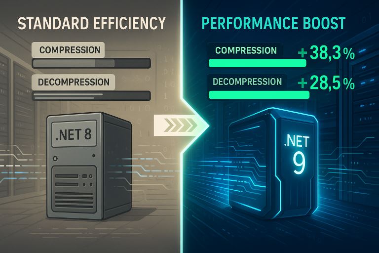 可見,.NET 9 無論是在壓縮還是解壓縮操作上,都表現(xiàn)出了遠(yuǎn)超 .NET 8 的性能。尤其是在壓縮速度上,提升幅度巨大,幾乎快了四成。