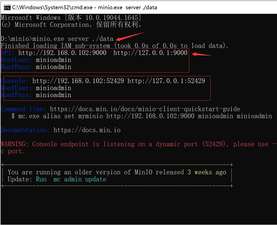 我們啟動(dòng)后控制臺(tái)會(huì)輸出如下信息,首先第一部分中是我們和Minio,進(jìn)程通信的服務(wù)地址和用戶名密碼