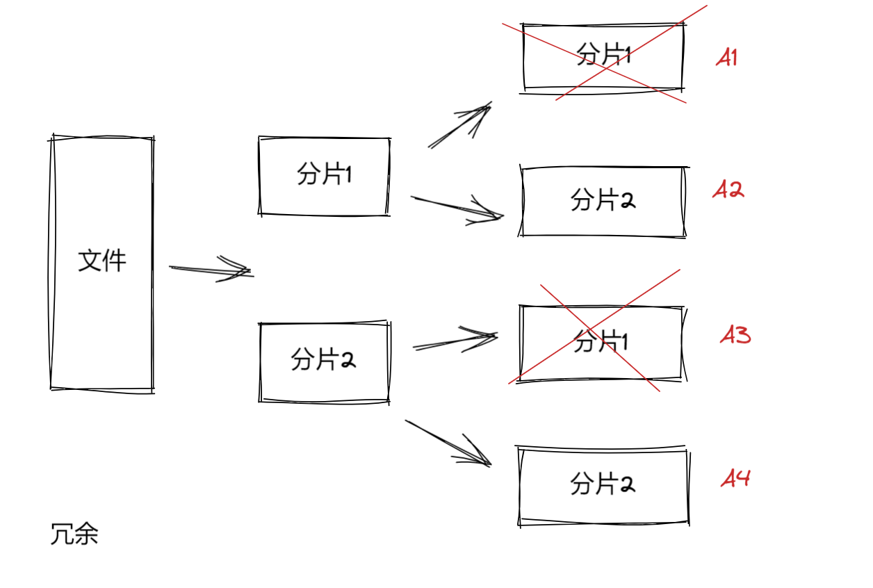 我們使用一個(gè)簡(jiǎn)單的例子來(lái)理解糾刪碼,首先從冗余思想來(lái)著手,假設(shè)我們?cè)诖鎯?chǔ)一份大小為2M的文件時(shí),按照4份副本冗余的做法,占用的空間就是 2Mx4的空間,先將文件分片為2份,我們?nèi)∶麨?strong>Sharding1、Sharding2,然后再做冗余 就是4份數(shù)據(jù),如果我們刪除A1和A2那么A3和A4可以繼續(xù)組合成一個(gè)完整的文件,同理刪除A3和A4它依然可以組合成完整文件。