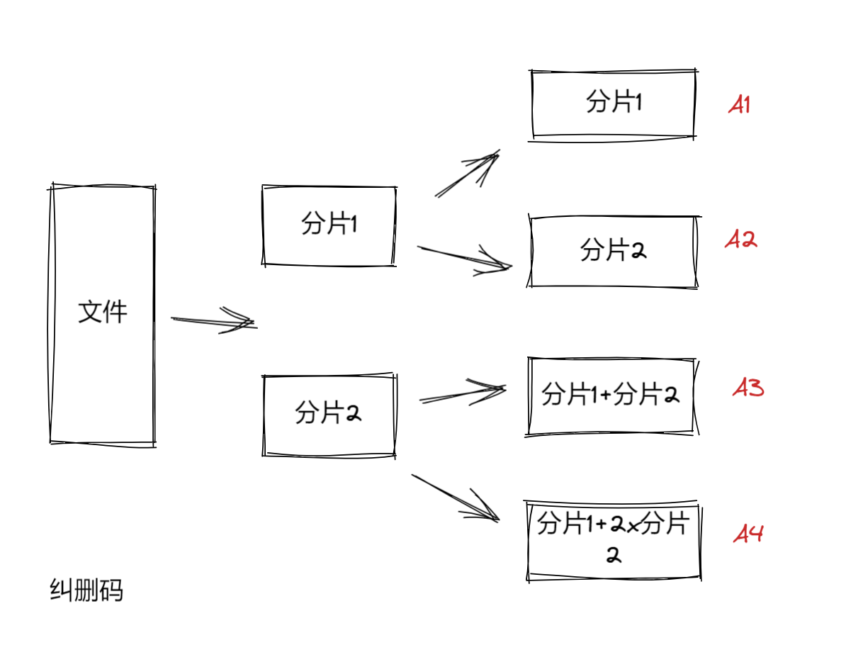 此時(shí)如果使用糾刪碼的做法就是,A1和A2分片數(shù)據(jù)還是保持不變,A3=分片1+分片2,A4 = 分片1+ 2*分片2,這樣任意兩份數(shù)據(jù)丟失,都可以恢復(fù)出分片1 和 分片2的數(shù)據(jù)了