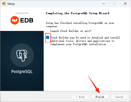 7、點(diǎn)擊finish之后即可完成PostgreSQL的安裝,如果不想安裝PostGIS空間拓展模塊就把方框的選項(xiàng)取消勾選 至此已經(jīng)完成了PostgreSQL的安裝,可以通過pgAdmin 4來登錄數(shù)據(jù)庫(kù),打開后輸入密碼即可