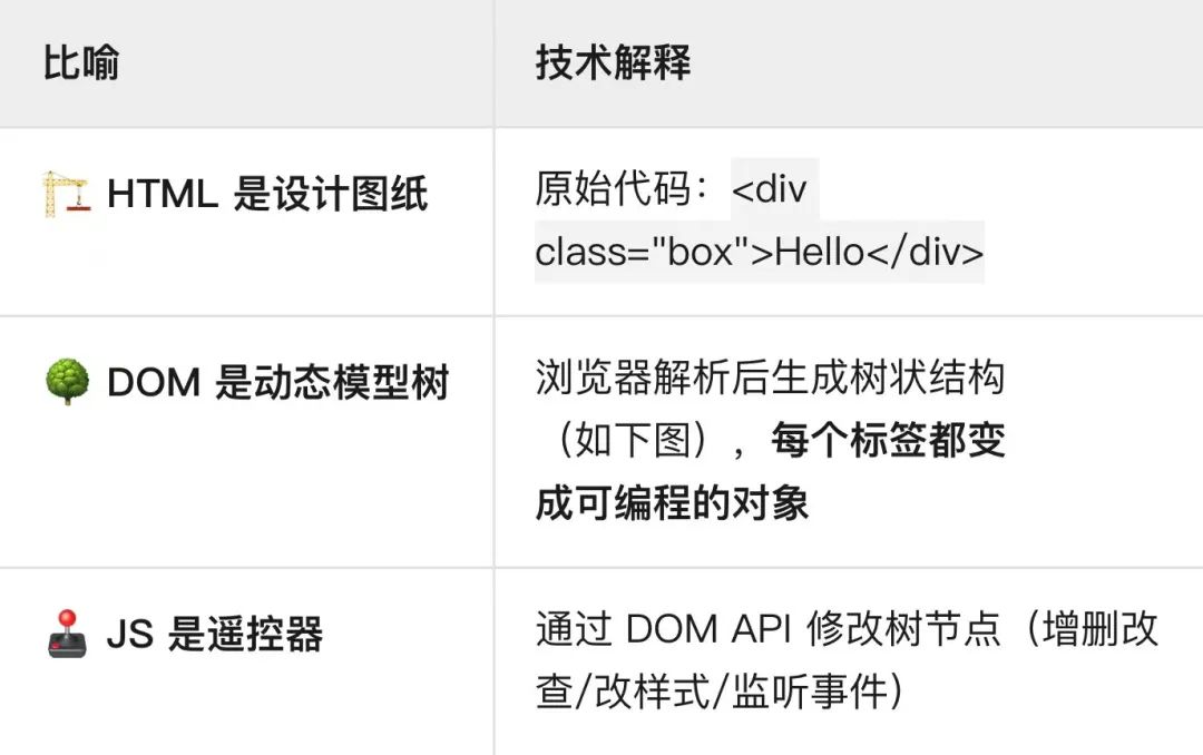 DOM(Document Object Model) 是瀏覽器將 HTML 文檔解析成的 結構化樹形模型,它讓 JavaScript 能動態(tài)操作網(wǎng)頁元素。 核心概念:
