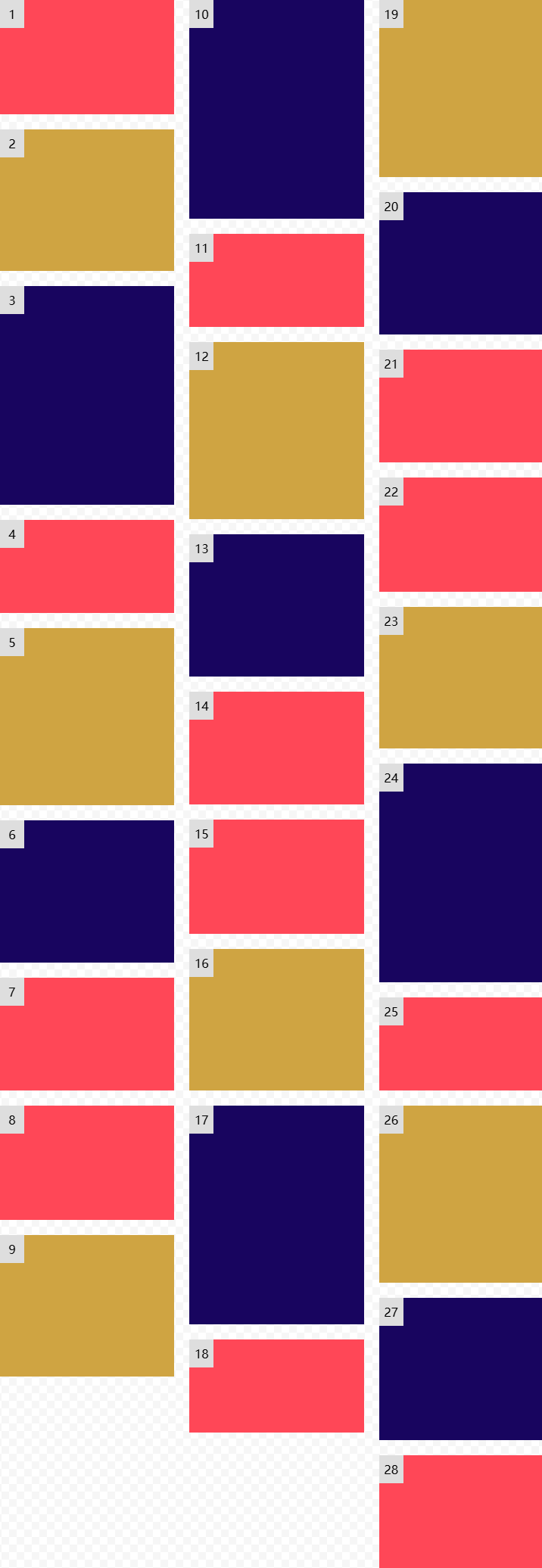 column 雖然不用控制每個(gè)子項(xiàng)的大小,但它的子元素排列順序是從上到下排列,并不是從左往右,這種情況如果數(shù)據(jù)存在分頁(yè)加載時(shí)候,就會(huì)出現(xiàn)內(nèi)容重新排列導(dǎo)致內(nèi)容閃動(dòng)。