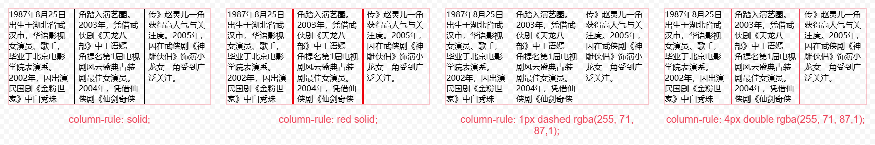 column-rule-style 與 border-style 一樣,支持值:none 、 hidden 、 dotted 、 dashed 、 solid 、 double 、 groove 、 ridge 、 inset 、 outset。