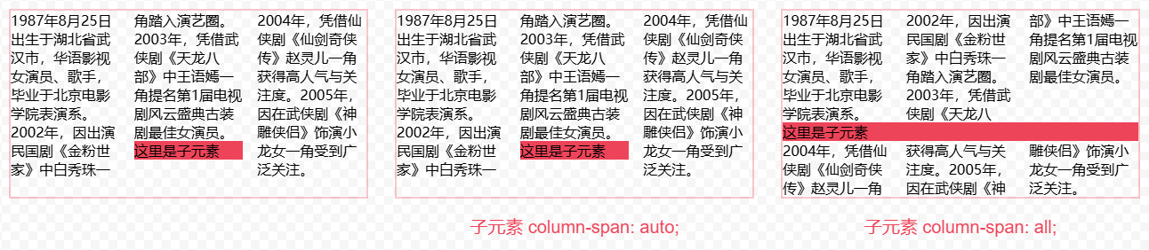 column-span 設(shè)置子元素是否跨列顯示。有效值:none(不跨列)、all(跨列)。
