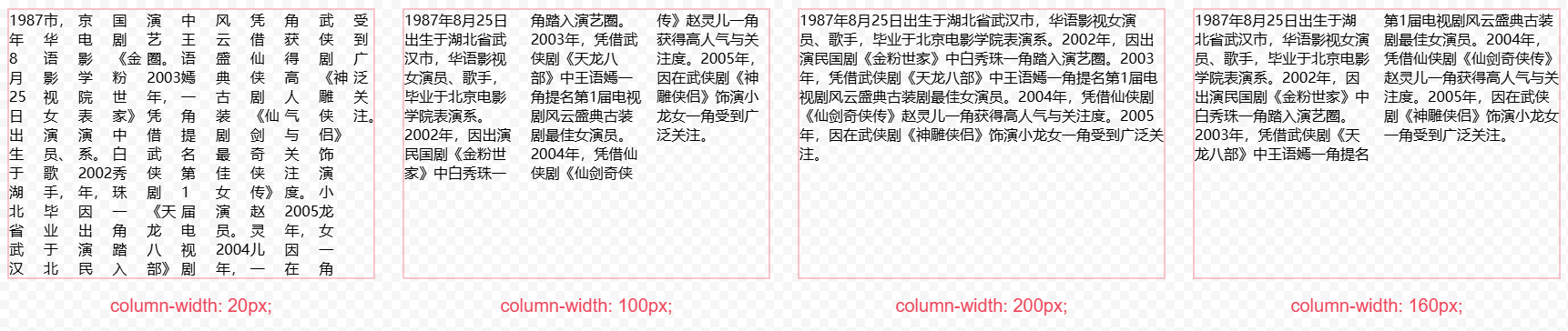 column-width 設(shè)置列的寬度。瀏覽器會(huì)自動(dòng)調(diào)整寬度大小,如果設(shè)置的寬度連兩列都放不下,會(huì)自動(dòng)變?yōu)橐涣酗@示(如圖三)。