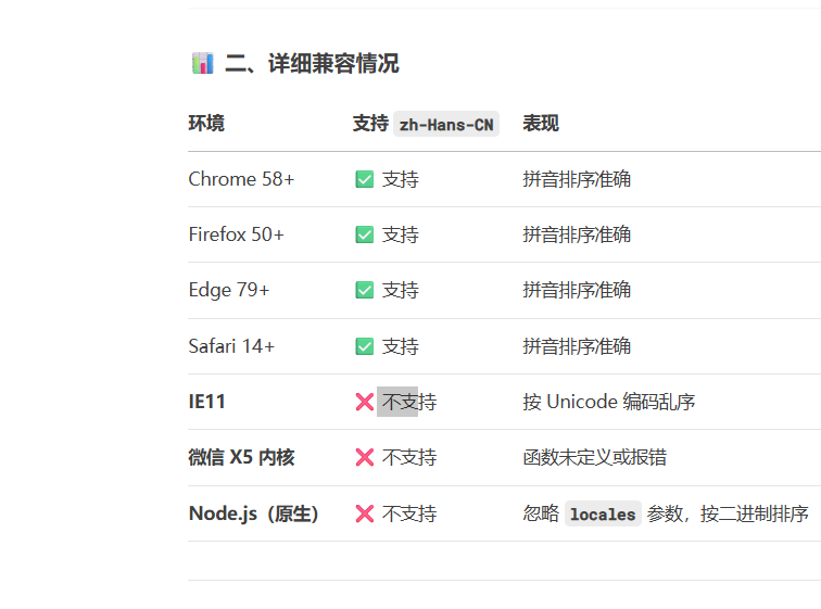 如:localeCompare函數(shù)在X5內(nèi)核(android版的微信瀏覽器)的瀏覽器不兼容該函數(shù),請(qǐng)注意使用。