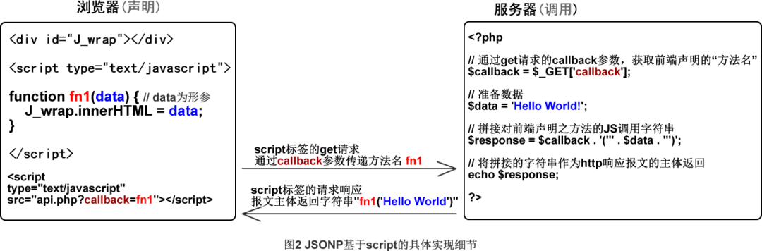 這個(gè)方案乍看之下似乎有兩個(gè)問題,一個(gè)是這個(gè)“JS方法”是如何實(shí)現(xiàn)前后端同步的? 再就是后端服務(wù)器上的動態(tài)腳本執(zhí)行環(huán)境怎么能調(diào)用前端瀏覽器上聲明的JS方法呢? 這里先回答第二個(gè)問題。那就是在這個(gè)情景下,說JS方法由后端調(diào)用,并不等于說執(zhí)行也是后端在做。 事實(shí)是,雖然調(diào)用是后端,但執(zhí)行其實(shí)還是在前端瀏覽器中。 而實(shí)現(xiàn)這種調(diào)用與執(zhí)行的分離,以及實(shí)現(xiàn)“JS方法”的同步,都是靠的一個(gè)相同的手段,那就是HTML的 script 標(biāo)簽。 這個(gè)script標(biāo)簽原本是用來通過http請求加載靜態(tài)的JavaScript腳本資源的??墒悄硞€(gè)老六突發(fā)奇想,用script加載起動態(tài)的JavaScript腳本,然后就誕生了JSONP的通信方式。 這里說的所謂“靜態(tài)的JavaScript腳本資源”,說的是放在服務(wù)器磁盤上一成不變的JavaScript文本資源,誰請求都是得到一個(gè)相同的副本,就像提前做好的預(yù)制菜一樣。 而所謂“動態(tài)的JavaScript腳本資源”,就是說JavaScript文本資源并不是現(xiàn)成的,請求實(shí)際是發(fā)向一個(gè)后端運(yùn)行的“動態(tài)腳本”,比如PHP、JSP之類的。然后JavaScript腳本則是由這些后端腳本再根據(jù)具體情況按需生成,整體而言就像“點(diǎn)菜現(xiàn)炒”。 具體說就是,這個(gè)“后端腳本”會根據(jù)http請求的具體參數(shù)的不同響應(yīng)返回不同的JavaScript腳本文本給瀏覽器端來執(zhí)行。 于是,那個(gè)計(jì)劃由“前端聲明后端調(diào)用”的JS方法的方法名便由前端創(chuàng)建,并由script標(biāo)簽發(fā)起的http請求的get參數(shù)同步給了后端。 接著,后端腳本則根據(jù)得到的JS方法名拼接一個(gè)對該方法進(jìn)行調(diào)用的JavaScript腳本片段,并將要傳輸給前端的數(shù)據(jù)作為此次調(diào)用的實(shí)參。 最后,這個(gè)由后端拼接的、帶著實(shí)參的“JS方法調(diào)用片段”便通過前端script標(biāo)簽發(fā)起的http請求的響應(yīng)報(bào)文從服務(wù)器返回給瀏覽器,并在瀏覽器端自動執(zhí)行。