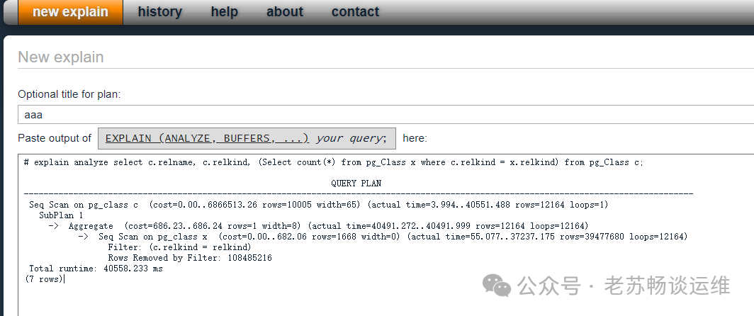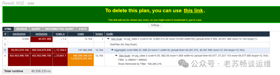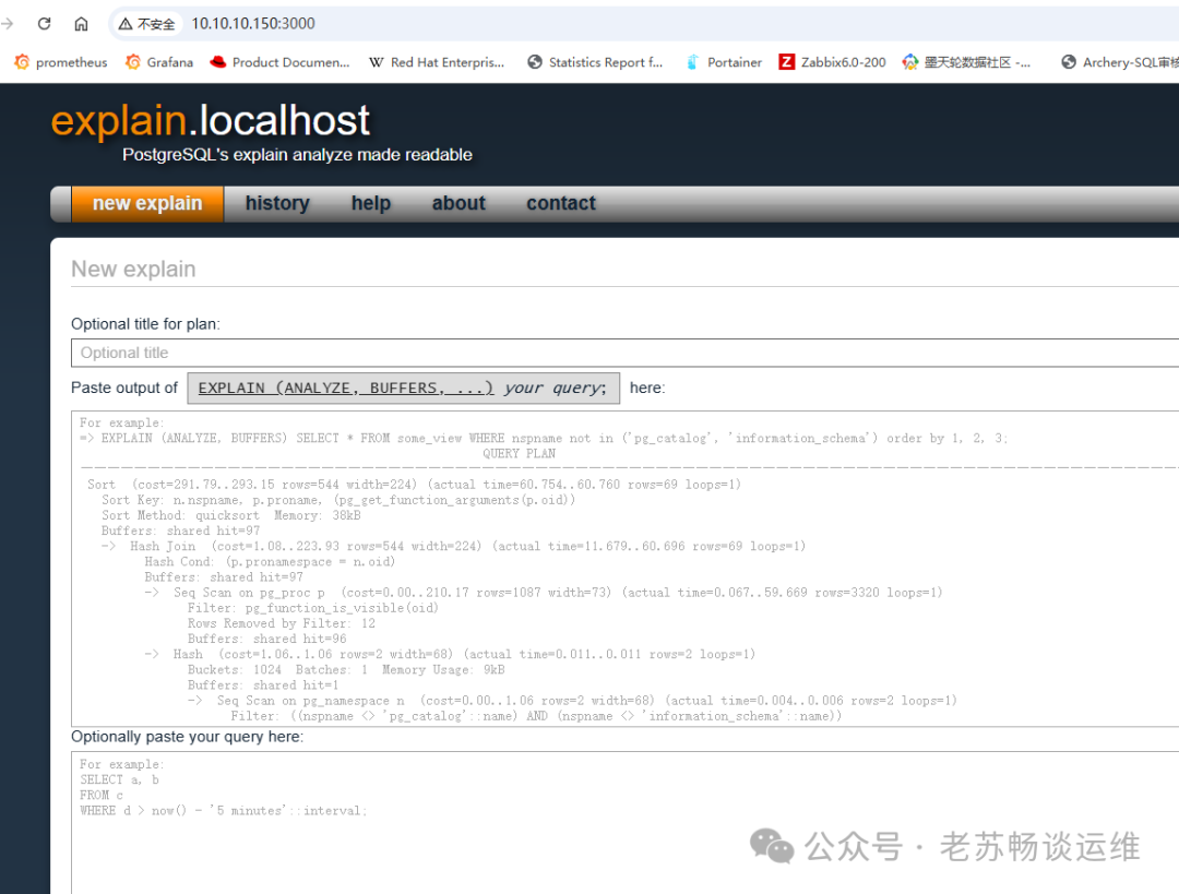 前言使用過(guò)Oracle的SQL Monitor的朋友都知道,它能夠?qū)?fù)雜的SQL執(zhí)行計(jì)劃解析為直觀的HTML可視化報(bào)告。清晰展示查詢的執(zhí)行路徑、耗時(shí)分布及資源消耗,幫助開(kāi)發(fā)者快速定位性能瓶頸,如表掃描、索引缺失、JOIN效率等問(wèn)題。對(duì)于診斷慢SQL,該工具提供分析支持,大幅提升數(shù)據(jù)庫(kù)調(diào)優(yōu)效率。那對(duì)于PostgreSQL數(shù)據(jù)庫(kù),有沒(méi)有類似的工具可以用來(lái)分析呢?答案是肯定的,那就是Depesz EXPLAIN ANALYZE visualizer,我們看一下它的使用方法。 在線訪問(wèn)方式可以直接訪問(wèn):https://explain.depesz.com/ ![]() 本地搭建方式當(dāng)然除了在線訪問(wèn),你可以本地部署,以下是本地部署步驟。 安裝Docker環(huán)境(此處略過(guò)Docker安裝步驟) 克隆項(xiàng)目源碼git clone https://gitlab.com/depesz/explain.depesz.com.git拉起鏡像進(jìn)入項(xiàng)目docker目錄并啟動(dòng)容器: cd docker/若出現(xiàn)鏡像拉取超時(shí): # docker-compose up --build解決方案:更換Docker鏡像源 編輯配置文件: cat /etc/docker/daemon.json內(nèi)容如下: {重啟Docker服務(wù): systemctl daemon-reload && systemctl restart docker驗(yàn)證部署查看運(yùn)行中的容器: docker ps正常輸出示例: CONTAINER ID IMAGE PORTS NAMES 若服務(wù)卡住,可嘗試: docker-compose start訪問(wèn)服務(wù)成功啟動(dòng)后訪問(wèn): http://[你的服務(wù)器IP]:3000![]() 使用方法使用方法簡(jiǎn)單:第一個(gè)標(biāo)題隨便輸入,第二個(gè)空欄貼上您的執(zhí)行計(jì)劃,接著點(diǎn)提交,即可基于當(dāng)前的執(zhí)行計(jì)劃生成一份HTML的報(bào)告。 ![]() ![]() 用紅色背景高亮顯示,是我們的重點(diǎn)觀察對(duì)象。 最后的stats列是SQL的總覽信息