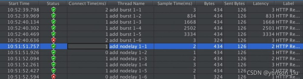 相比實(shí)例一成功數(shù)增加了4個(gè),這個(gè)我們?cè)O(shè)置的burst數(shù)目是一致的。具體處理流程是:1個(gè)請(qǐng)求被立即處理,4個(gè)請(qǐng)求被放到burst隊(duì)列里,另外一個(gè)請(qǐng)求被拒絕。通過burst參數(shù),我們使得Nginx限流具備了緩存處理突發(fā)流量的能力。 但是請(qǐng)注意:burst的作用是讓多余的請(qǐng)求可以先放到隊(duì)列里,慢慢處理。如果不加nodelay參數(shù),隊(duì)列里的請(qǐng)求不會(huì)立即處理,而是按照rate設(shè)置的速度,以毫秒級(jí)精確的速度慢慢處理。 實(shí)例三 nodelay降低排隊(duì)時(shí)間 實(shí)例二中我們看到,通過設(shè)置burst參數(shù),我們可以允許Nginx緩存處理一定程度的突發(fā),多余的請(qǐng)求可以先放到隊(duì)列里,慢慢處理,這起到了平滑流量的作用。但是如果隊(duì)列設(shè)置的比較大,請(qǐng)求排隊(duì)的時(shí)間就會(huì)比較長(zhǎng),用戶角度看來就是RT變長(zhǎng)了,這對(duì)用戶很不友好。有什么解決辦法呢?nodelay參數(shù)允許請(qǐng)求在排隊(duì)的時(shí)候就立即被處理,也就是說只要請(qǐng)求能夠進(jìn)入burst隊(duì)列,就會(huì)立即被后臺(tái)worker處理,請(qǐng)注意,這意味著burst設(shè)置了nodelay時(shí),系統(tǒng)瞬間的QPS可能會(huì)超過rate設(shè)置的閾值。nodelay參數(shù)要跟burst一起使用才有作用。 延續(xù)實(shí)例二的配置,我們加入nodelay選項(xiàng): 單個(gè)IP 10ms內(nèi)并發(fā)發(fā)送6個(gè)請(qǐng)求,結(jié)果如下: