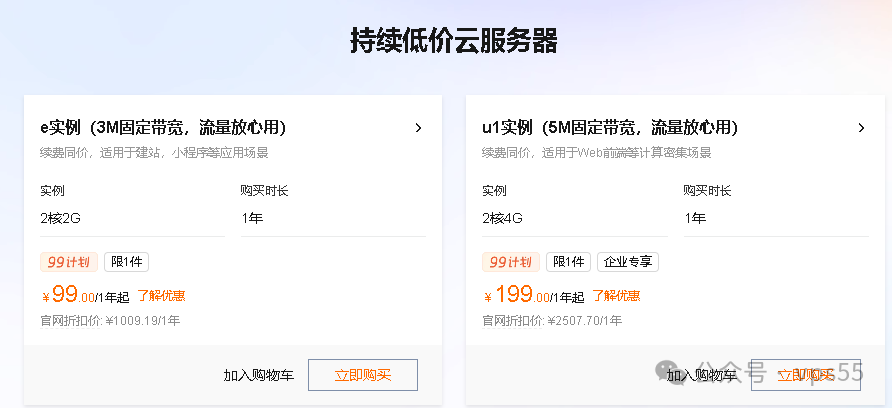 阿里云輕量應(yīng)用服務(wù)器和云服務(wù)器怎么樣?2025年阿里云最便宜的vps云服務(wù)器匯總,價格最為便宜的輕量應(yīng)用服務(wù)器有2核2G價格為68元1年;2核4G4M 60GB高效云盤,價格為298元1年;經(jīng)濟型e實例2核2G,40G ESSD Entry盤,3M帶寬,價格為99元1年;通用算力型u1實例2核4G,80G ESSD Entry盤,5M帶寬,價格為199元1年。這個價格是2025年截至目前阿里云的活動中價格最低的幾款云服務(wù)器產(chǎn)品了,那么這兩款款輕量應(yīng)用服務(wù)器和云服務(wù)器怎么樣?作為用戶的我們應(yīng)該如何選擇呢?本文將詳細解析阿里云目前最便宜的幾款云服務(wù)器產(chǎn)品,包括輕量應(yīng)用服務(wù)器和特價云服務(wù)器實例,幫助用戶更好地了解并選擇適合自己的云服務(wù)器。 阿里云官網(wǎng)活動地址:https://vps55.com/www/aliyun-vps? 一、輕量應(yīng)用服務(wù)器阿里云輕量應(yīng)用服務(wù)器:購買直達 產(chǎn)品概述輕量應(yīng)用服務(wù)器(Simple Application Server)是阿里云推出的一款面向個人開發(fā)者、小微企業(yè)及學(xué)生用戶的高性價比云服務(wù)器產(chǎn)品。它提供了快速部署、易于管理和豐富的鏡像選擇等特點,非常適合搭建個人網(wǎng)站、小型應(yīng)用或進行開發(fā)測試。 價格與配置根據(jù)最新信息,阿里云輕量應(yīng)用服務(wù)器提供了多款低價配置選項。其中,2核2G配置的輕量應(yīng)用服務(wù)器,新用戶首年價格低至68元。對于個人用戶和小型企業(yè)來說,完全能夠滿足基本的網(wǎng)站和應(yīng)用部署需求。 此外,阿里云還經(jīng)常推出優(yōu)惠活動,如新用戶專享優(yōu)惠、續(xù)費優(yōu)惠等,進一步降低了用戶的使用成本。 優(yōu)勢分析