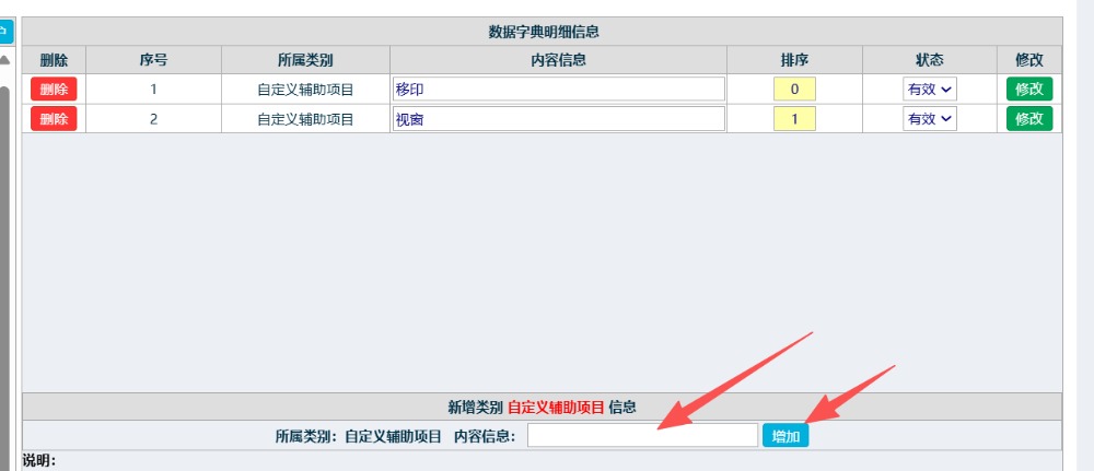 輸入自定義的項(xiàng)目內(nèi)容,點(diǎn)擊添加即可,如下圖所示: ![]() 點(diǎn)晴模切ERP更多信息:http://moqie.clicksun.cn,聯(lián)系電話:4001861886 該文章在 2025/10/11 16:32:48 編輯過 |