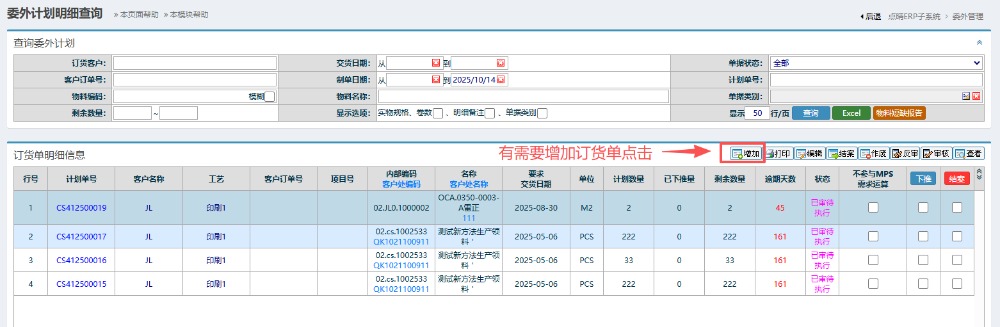 注:如果不了解MPS運算可以點擊下方鏈接進行了解: 請簡單介紹一下什么是MPS(主生產計劃)http://13297.oa22.cn 4.如果有需要增加委外加工計劃的話,可以按下圖操作:點擊增加