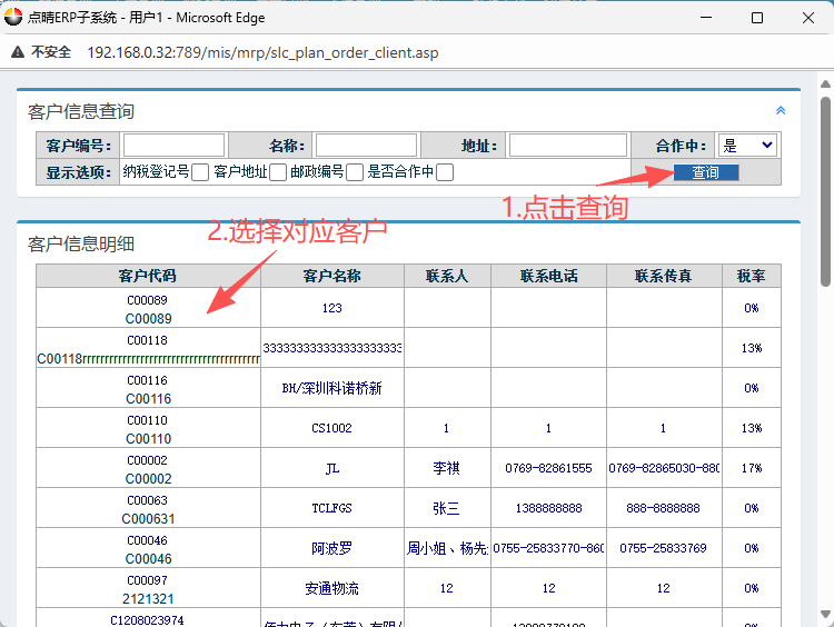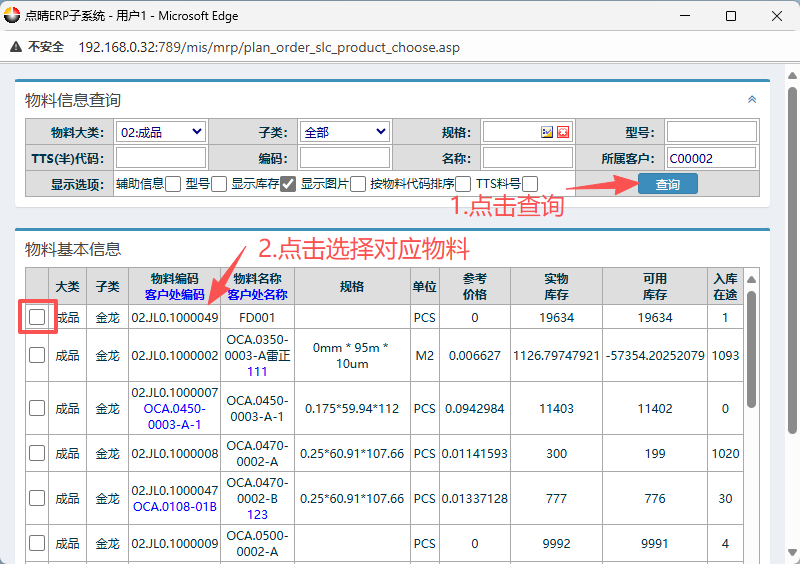 選好客戶后,在下方點擊“物料編碼”,彈出對應窗口。 在窗口內點擊查詢,然后點擊選擇對應的物料信息。