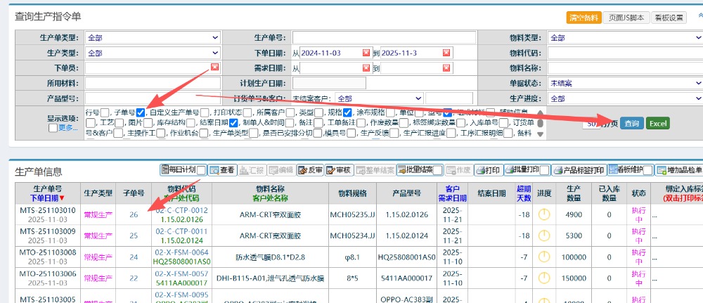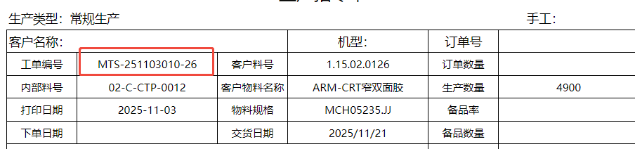 答:正常打印出來的生產工單號后面如果多了類似“-26”的情況那個是“子單號”,主要是用于后續(xù)批量發(fā)料操作的。 一般正常情況只需要看橫杠前面的單號為準。 后續(xù)如果還有出現(xiàn)類似子單號的情況的話可以在生產工單的頁面內取消勾選“子單號”進行查詢。 ? 點晴模切ERP更多信息:http://moqie.clicksun.cn,聯(lián)系電話:4001861886 該文章在 2025/11/4 10:29:55 編輯過 |