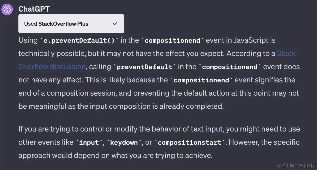 上面大概的意思就是compositionend事件里使用 e.preventDefault() 在技術(shù)上可行的,但它可能不會(huì)產(chǎn)生你期望的效果??赡苁且?yàn)?code style="font-family: Menlo, Monaco, Consolas, "Courier New", monospace; font-size: 0.87em; word-break: break-word; border-radius: 2px; overflow-x: auto; background-color: rgb(255, 245, 245); color: rgb(255, 80, 44); padding: 0.065em 0.4em;"> compositionend 事件標(biāo)志著一次輸入構(gòu)成(composition)會(huì)話的結(jié)束,而在這個(gè)點(diǎn)上阻止默認(rèn)行為可能沒(méi)有意義,因?yàn)檩斎氲牧鞒桃呀?jīng)完成了。