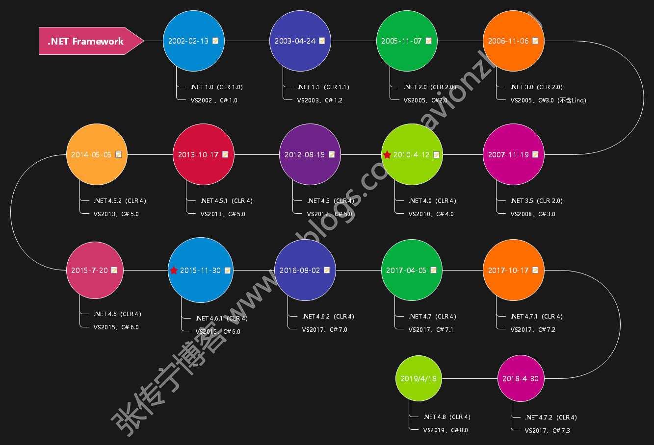 自1995年互聯(lián)網(wǎng)戰(zhàn)略日以來最雄心勃勃的事業(yè) —— 微軟.NET戰(zhàn)略, 2000年6月30日?!?/span> 微軟公司于2002年2月13日正式推出第一代.NET平臺 .NET Framewrok 1.0。借助于自家強大易用的 Windows 系統(tǒng),.NET Framework1.0 主要提供了面向 Windows 桌面(Windows Form)和服務器(ASP.NET Web Forms)的基礎開發(fā)框架。在宇宙第一IDE(Visual Studio)中使用這兩款框架進行業(yè)務系統(tǒng)開發(fā),框架中都提供了功能強大的控件、組件,開發(fā)者通過可視化編程方式進行開發(fā)就非常容易上手,而且開發(fā)速度非???,因此.NET平臺深受全世界開發(fā)者的喜愛,發(fā)展一路順風順水。 .NET Framework 發(fā)展歷程 針對.NET Framework,微軟.NET技術團隊對其不斷優(yōu)化,增加新功能,目前最新版本為 .NET Framework 4.8,這也是.NET Frameork 的最后一個版本。但是微軟團隊會繼續(xù)為其提供安全性和可靠性bug修補程序。并且開發(fā)者可以一直使用下去。如果需要進行新的開發(fā),建議使用 .NET5.0 或者更高版本。
