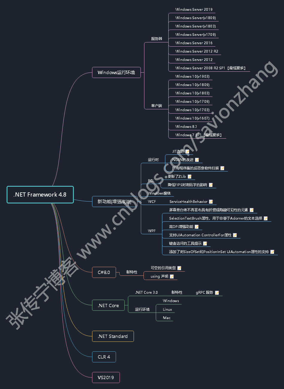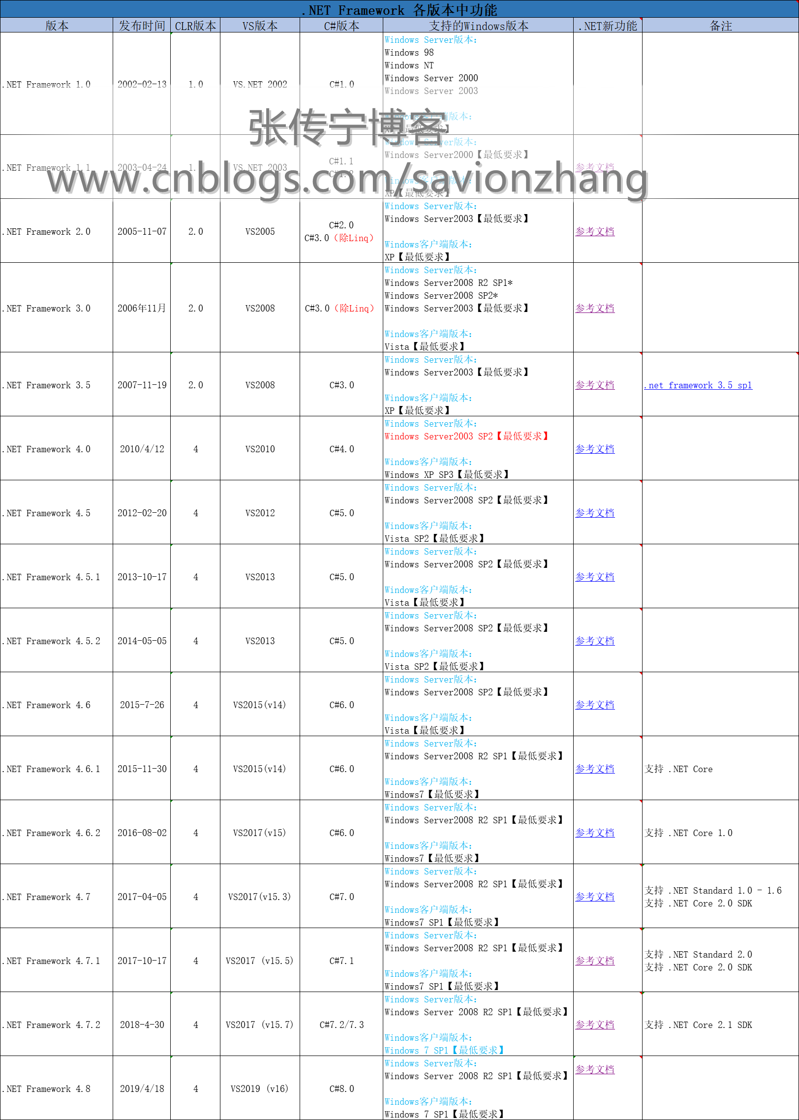 .NET Framework 版本對比 .NET Framework 從1.0發(fā)展到4.8版本,由于每個版本的功能設計與發(fā)行目標不同,運行時、開發(fā)工具、編程語言、支持的Windows版本等有不同的差異,下表列出了詳細的對比信息。