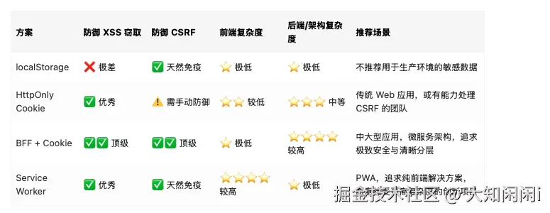 ?如果應(yīng)用規(guī)模較小且暫時(shí)無法引入 BFF,HttpOnly Cookie 配合嚴(yán)格的 SameSite 策略和 CSRF Token,依然是比 localStorage 安全得多的可靠選擇。