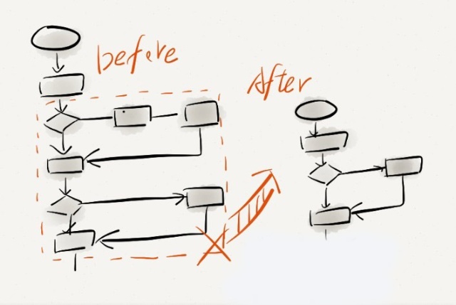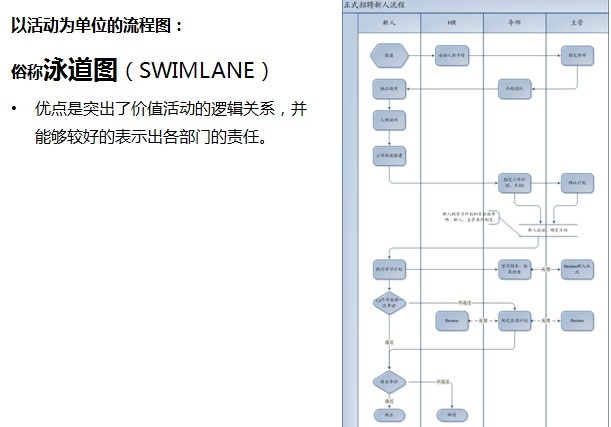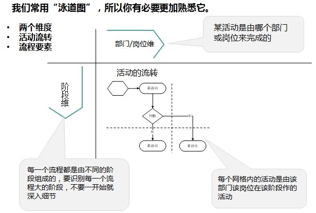 當(dāng)然,除了業(yè)務(wù)流程,系統(tǒng)流程,頁面流程,還有數(shù)據(jù)流程被人關(guān)注。 我們平時(shí)工作中,還會(huì)經(jīng)常聽人談到泳道圖啊,任務(wù)流程圖啊等等概念,究竟是神馬關(guān)系呢? ![]() 圖5:流程圖的分類 本文著重于上述流程中的“業(yè)務(wù)流程圖”——并會(huì)分享如何繪制泳道圖——也即是PD們最多使用,技術(shù)們最多參考,UED們最多看到的流程圖。 本來在第四部分會(huì)對(duì)泳道圖的圖示以及繪制方法、原則做更詳細(xì)的說明,但是看目前的篇幅情況,預(yù)計(jì)會(huì)放到下篇,所以先在這里簡(jiǎn)單說明下吧。 在工作中,我們經(jīng)常能夠看到兩種業(yè)務(wù)流程圖,從表現(xiàn)形式來看,一種很好區(qū)分,俗稱為“泳道圖”的它,在樣子上也確實(shí)像個(gè)泳道,可以有橫向的泳道,也會(huì)有縱向的泳道。泳道圖在某些文檔里會(huì)被稱為“以活動(dòng)為單位的流程圖”,浮在泳道中的都是一個(gè)個(gè)活動(dòng)。 ![]() 另外一種類型是以部門和崗位為單位的流程圖,下圖中的圓形就代表一個(gè)個(gè)部門或崗位。矩形代表活動(dòng)。這種流程圖關(guān)注事情如何完成的邏輯,但是在體現(xiàn)各個(gè)部門的責(zé)任上比較弱。如果是某個(gè)崗位的人來看,很難像泳道圖那樣一眼就能看到自己部門的職責(zé)和任務(wù)。所以現(xiàn)在用得比較少。 ![]() 再回過頭來說泳道圖,泳道圖有幾個(gè)關(guān)鍵點(diǎn):兩大維度,活動(dòng)流轉(zhuǎn),流程要素。我們會(huì)在以后詳解。 ![]() 第三部分:為什么需要業(yè)務(wù)流程圖? 流程圖可以提供一種簡(jiǎn)單扼要的“縮略俯瞰圖”,幫助觀眾快速了解業(yè)務(wù)如何運(yùn)轉(zhuǎn)。它包含了幾個(gè)關(guān)鍵詞:誰,什么時(shí)候,在什么條件下,做了什么事情,輸入什么,輸出什么,輸出給誰…… 與系統(tǒng)流程不同,業(yè)務(wù)流程更關(guān)注于業(yè)務(wù)本身如何運(yùn)作,講的是業(yè)務(wù)故事,包含的是業(yè)務(wù)規(guī)則。而系統(tǒng)流程則是滿足業(yè)務(wù)流程,實(shí)現(xiàn)部分流程或全部流程的信息化和系統(tǒng)化。 所以業(yè)務(wù)流程是所有環(huán)節(jié)的前置條件——軟件需求分析,信息系統(tǒng)建設(shè)也會(huì)先進(jìn)行業(yè)務(wù)流程的梳理。 下面表現(xiàn)了業(yè)務(wù)流程圖是如何在三個(gè)主要場(chǎng)景中發(fā)揮作用的: 1. 員工培訓(xùn) ![]() 圖6:流程圖的應(yīng)用場(chǎng)景之一:培訓(xùn) 在此場(chǎng)景中:流程圖能夠提供一種快速了解業(yè)務(wù)如何運(yùn)作的視圖,通過業(yè)務(wù)流程圖,新員工能夠快速明白業(yè)務(wù)的最終目標(biāo)是什么,中有哪些角色在參與以及他們的職責(zé),以及彼此之間的聯(lián)接。 除了培訓(xùn)新員工,在員工輪崗、調(diào)職場(chǎng)景中,員工也需要業(yè)務(wù)流程圖參考,明白新的工作內(nèi)容如何開展,以及自己所處的位置,自己的上游是誰,下游是誰,自己需要交付的工作內(nèi)容是什么。 2:流程優(yōu)化與重組 ![]() 圖7:流程圖的應(yīng)用場(chǎng)景之二:流程優(yōu)化 業(yè)務(wù)流程重組(Business Process Reengineering)的存在可以明確反駁:存在即合理。事實(shí)上,存在的業(yè)務(wù)流程并未是合理的,有可能是參與的多個(gè)角色習(xí)慣了某種做法,有可能是變革尚未影響到末端的操作,也有可能缺乏對(duì)于運(yùn)行中的業(yè)務(wù)流程問題的洞察以及強(qiáng)有力的變革推動(dòng)——因?yàn)橐苿?dòng)業(yè)務(wù)流程變革,不是某個(gè)部門的事情,而是需要流程中各個(gè)部門的通力配合。 更多時(shí)候,業(yè)務(wù)流程優(yōu)化是自上而下的,但是老板們未必對(duì)實(shí)際運(yùn)作的業(yè)務(wù)流程那么心知肚明,業(yè)務(wù)流程圖能夠很好去表現(xiàn)這個(gè)“運(yùn)作模型”。通過看業(yè)務(wù)流程圖,找關(guān)鍵節(jié)點(diǎn)的人訪問,能夠直接切入:為什么要這么做,為什么不這么做?從而探索出更深層次的問題,而不是問:你們現(xiàn)在怎么做? 通過調(diào)研,分析業(yè)務(wù)流程圖,引入更多角色,能夠分析出目前業(yè)務(wù)流程的問題:缺失,重復(fù),風(fēng)險(xiǎn),效率等等。從而制定相應(yīng)的優(yōu)化方案。 3:信息化的基礎(chǔ) ![]() 圖8:流程圖的應(yīng)用場(chǎng)景之三:信息化基礎(chǔ) 正如上文所述的餐館夢(mèng)想的案例,信息系統(tǒng)的一項(xiàng)任務(wù)就是解放員工的手腳,取代一些重復(fù)的人力勞動(dòng)工作。系統(tǒng)上了之后,不是說業(yè)務(wù)流程不需要而是經(jīng)過了一些調(diào)整,其中某個(gè)參與者變成了系統(tǒng),或手持設(shè)備,或打印機(jī)而已。 那么在做系統(tǒng)的功能設(shè)計(jì)和系統(tǒng)流程設(shè)計(jì)時(shí),是不是必須先要了解目前業(yè)務(wù)是如何運(yùn)作的呢?從而更好分析分析,更好說明系統(tǒng)在什么環(huán)節(jié)取代了什么類型的人肉工作? 所以我們看到的PRD往往也會(huì)先以業(yè)務(wù)流程圖開始說明,而敘述一個(gè)系統(tǒng)建設(shè)的好處時(shí),也可以用以前的業(yè)務(wù)流程與系統(tǒng)上了之后的業(yè)務(wù)流程進(jìn)行對(duì)比。根據(jù)分析,將愿景中的新的業(yè)務(wù)流程圖背后需要系統(tǒng)的功能點(diǎn)撰寫清楚。 第四部分: