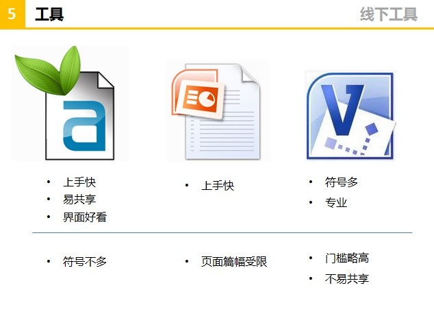 3. 評(píng)審與確認(rèn)——能否真正讓業(yè)務(wù)流程圖反映現(xiàn)實(shí)中的業(yè)務(wù)? 4. 歸檔維護(hù)——流程不斷變更,業(yè)務(wù)流程圖如何快速響應(yīng)? 這些將會(huì)在下篇《業(yè)務(wù)流程圖的繪制流程分享(二)》詳解。 第五部分:繪制工具? 如果不搞工具研討會(huì)的話,這部分比較簡(jiǎn)單. Windows: 線下工具大家常用的就是下面三個(gè): 小的流程圖用用PPT就夠了,完了就導(dǎo)出圖片或截圖。交互設(shè)計(jì)師們因?yàn)槌S胊xure繪制線框圖,所以也不必為了流程圖去學(xué)習(xí)新的工具,完全可以用axure的flow控件完成簡(jiǎn)單的業(yè)務(wù)流程圖的制作。而PD們則常用微軟的visio。 ![]() 此外,特別推薦一個(gè)軟件:SmartDraw。 我最近的流程圖都是用SmartDraw繪制的,你可以下載一個(gè)免費(fèi)版本體驗(yàn)下。這個(gè)工具不僅僅是為了流程圖而設(shè)計(jì)的,幾乎上包羅萬象:線框圖,流程圖,E-R圖,UML ,韋恩圖,甚至甘特圖,腦圖……沒有像很多人推薦就是因?yàn)樗嫶罅?,尤其是里面的模版。大家體驗(yàn)下: ![]() Mac電腦: 自然要推薦omniGraffle. 繪制出來的任何圖表不知為何總會(huì)覺得很美…… 當(dāng)然,這個(gè)軟件是可以去www.macx.cn下載免費(fèi)版的…… 但是不管windows還是mac,除了線下的工具,還有更多線上的選擇: 不過貌似我們對(duì)線上工具普遍來說都不太放心,是對(duì)服務(wù)器,網(wǎng)速,還有對(duì)GFW不放心吧。 ![]() 這個(gè)是界面做得最好看的一個(gè)工具。我用它來繪制過概念圖(Concept map)。如下圖即是用以上的工具畫的。 ![]() 2. http://creately.com/ ![]() 3. www.lucidchart.com ![]() 轉(zhuǎn)載請(qǐng)注明來處,關(guān)注我請(qǐng)點(diǎn)擊:http://weibo.com/heidixie 該文章在 2012/11/19 9:53:59 編輯過 |